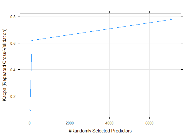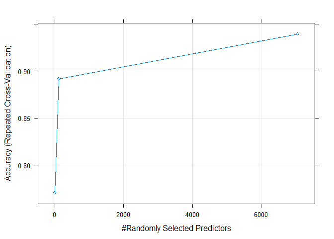 rangerisafastimplementationofrandomforests(Breiman2001)orrecursivepartitioning,,regression,RandomForest(Breiman2001),survivalforestsasinRandomSurvivalForests().if(('rda/ranger_')){ranger_default-readRDS("rda/ranger_")}else{(1)ranger_default-train(x=train_data,y=train_data_group,method="ranger",trControl=trControl)saveRDS(ranger_default,"rda/ranger_")}ranger_defaultRandomForest59samples7070predictors2classes:'DLBCL','FL'Nopre-processingResampling:Cross-Validated(10fold,repeated3times)Summaryofsamplesizes:52,52,54,53,53,53,Resamplingresultsacrosstuningparameters:''washeldconstantataval=7069,splitrule==1.