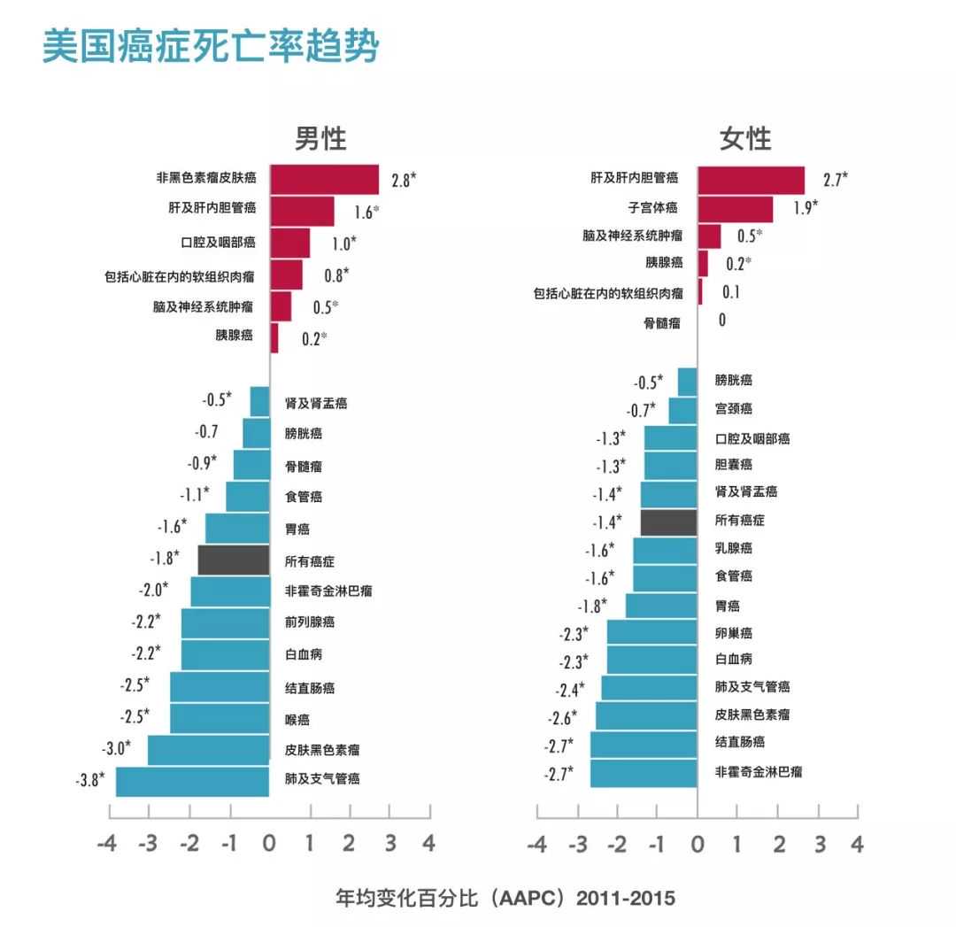 女性20种最常见癌症中的14种死亡率下降,其中非霍奇金淋巴瘤的死亡率降幅最大;另有4种癌症死亡率增加,其中肝癌增幅最大。