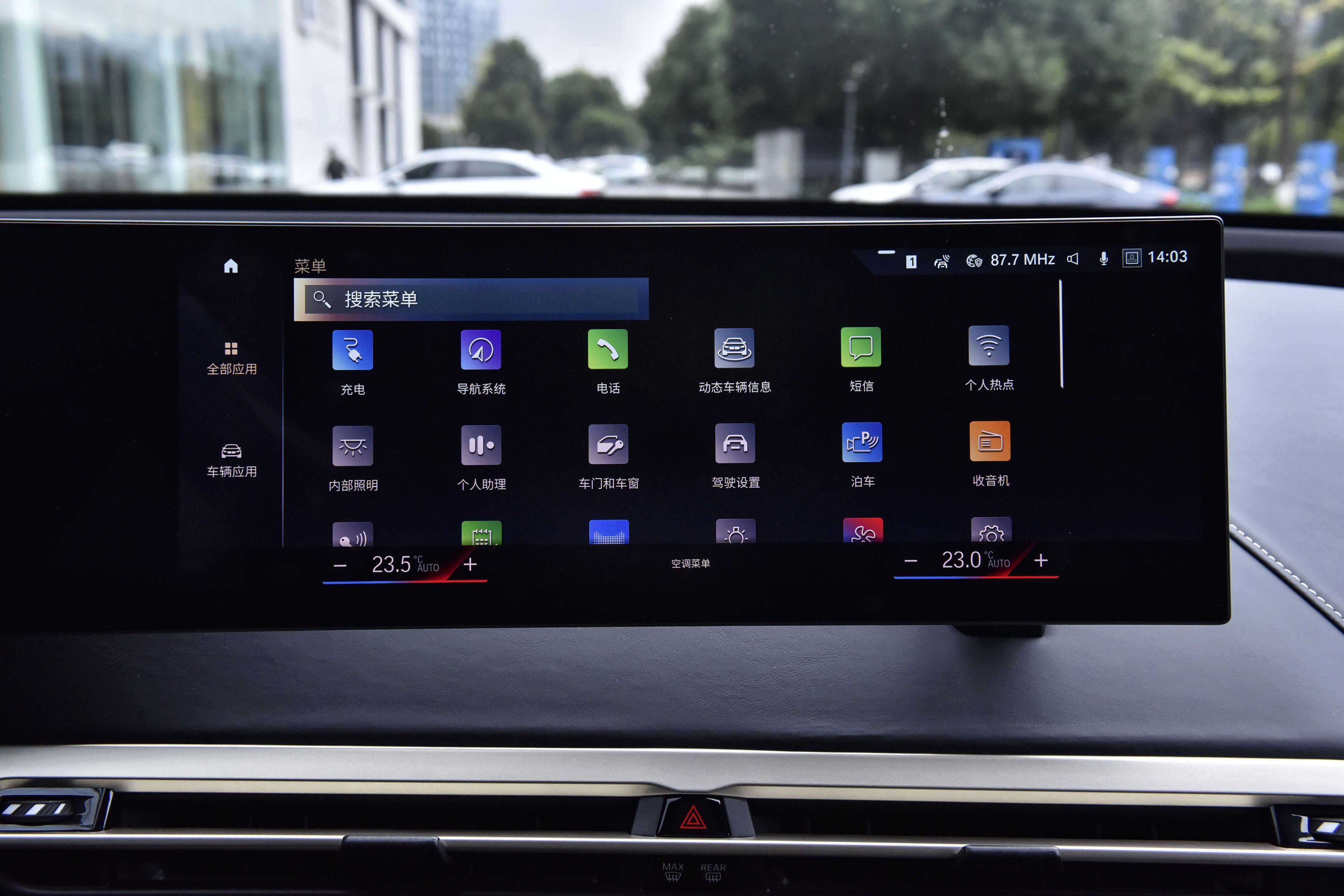 在内饰部分,宝马iX开创了全新内饰设计语言的先河,成为宝马首款采用一体式曲面大联屏的量产车型,将12.3英寸的仪表盘与14.9英寸的触摸式中央显示屏合二为一,并将车内物理按键减少约50%,由于其在宝马家族的引领者地位,未来更多宝马电动车型或将继承这一设计理念。
