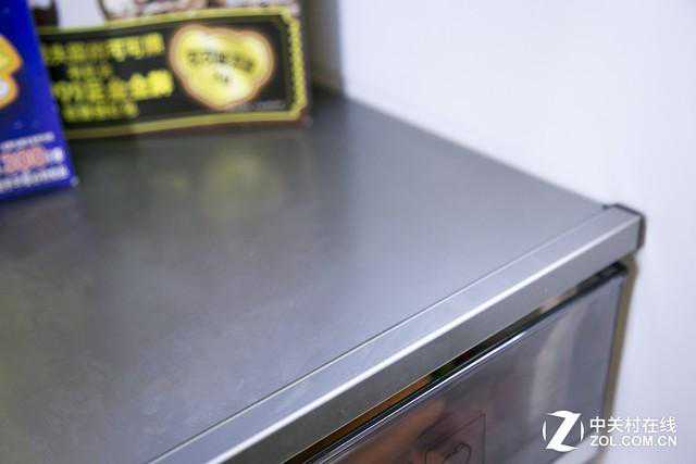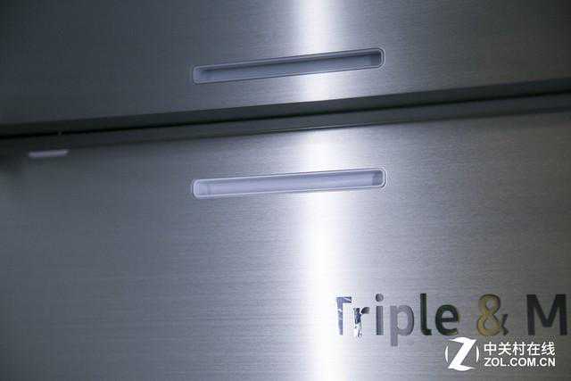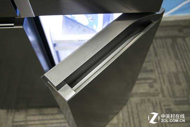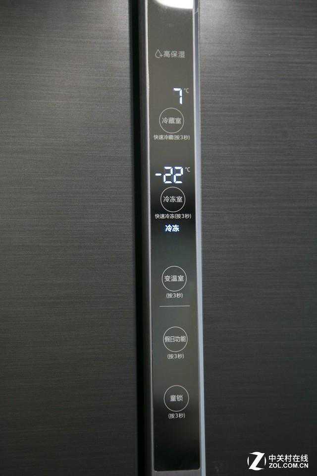 这款冰箱的整体空间较大,自然外观尺寸就不可能太小,所以这款冰箱为了节省空间和保证产品的外观,将冰箱的把手设置成了内嵌式隐藏结构,节省空间的同时,很好的避免因为外置把手可能造成的不必要磕碰造成的安全隐患。冰箱的操作面板使用了隐藏设计,位于冰箱右侧的门板的最左侧,在不操作时为熄灭状态,避免形成光污染,在操控时反应灵敏,并带有冰蓝色LED背光,显示清晰,操作简便,很好的兼顾了美观和实用。