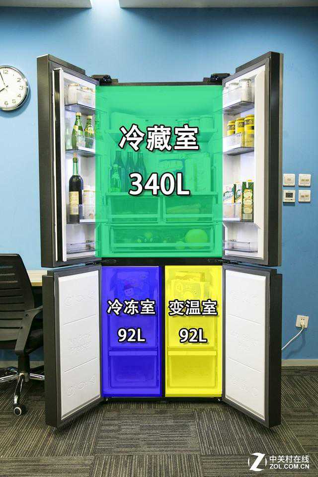 这款冰箱的总容积为524380L,打开冰箱的门体能够看到冰箱中的所有空间,上方为冷藏室空间,下方左侧为冷冻室空间,下方右侧为变温室空间,其中冷藏室空间为340L,冷冻室空间为92L,变温室空间为92L。