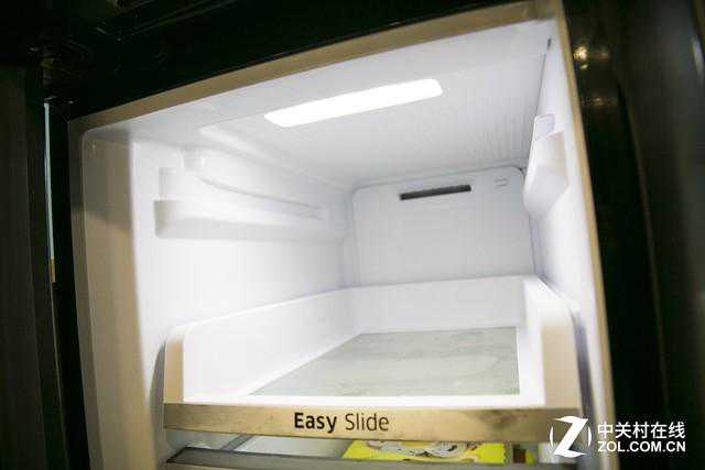 冷藏室中有两层三个保鲜抽屉,上方两个抽屉并排放置,下方抽屉体积较大,提供了超大的新鲜蔬菜水果储存空间。对此,三星大大提升了这款冰箱内部的保鲜和杀菌效果,这一点我们会在后面进行详细讲解。