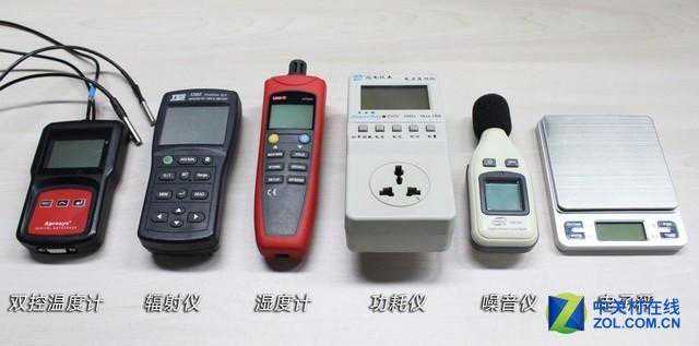 好了,我们看过了这款冰箱的所有主观评测部分,下面就到了实际检测冰箱性能的时候,这部分测试我们将采用完全公正的客观测试方法,为您真实检测冰箱的使用效果。这一部分,我们将检测冰箱保鲜能力、冰箱保湿能力、冷藏/冷冻室制冷速度、冰箱功耗噪音辐射这4项内容。我们需要使用的仪器如下,从左向右依次为:双控温度计、辐射仪、湿度计、功耗仪、噪音仪和电子秤。