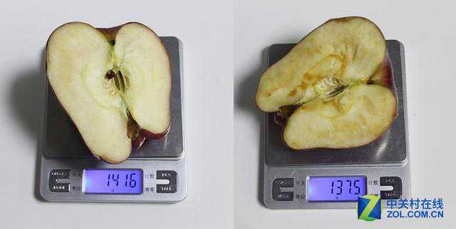 切半苹果重量由141.6g降至137.5g,重量下降4.1g,失水率为2.8%