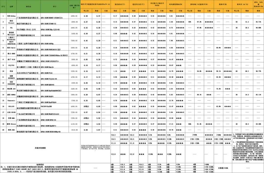经测试,5款样品中新风量最高的是米家牌KFR-35GW/F1A1型空调,数值为60.2m3/h;TCL牌KFRd-35GW/DBp-XJ21+B1型空调新风量实测值为50.3m³/h,明显高于其明示值30m³/h。