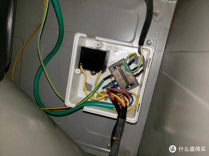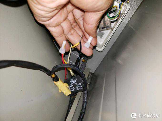 拆开盖子之后,果然见到了左边的启动电容,把黄色的两条线剪断。