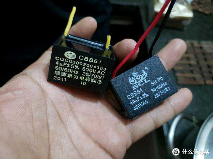 拆下的电容和新买的电容对比下,因为没有500v的,只买到450v的,影响不大,启动电容是不分正负极的,随便接。