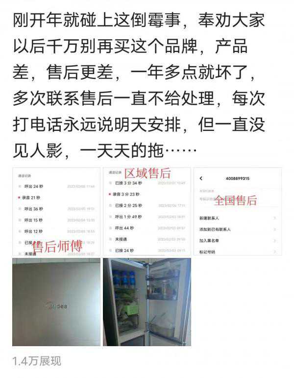 “用了一年多就坏了,不仅产品质量有问题,售后更是问题。”2021年8月,周先生花1699元买了一台美的冰箱,到今年2月2日时冰箱突然不制冷了,于是他第二天一早就拨打了美的官方售后热线报修,“客服说会马上联系当地是维修师傅2小时内上门,可是我一直等到晚上6点才等来维修师傅。”