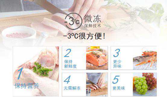与零度保鲜不同,-3°C微冻保鲜仅使食物表面稍微冻结,不会损伤食物细胞,解冻时基本不会有血水、汁水溢出,最大限度保留生鲜食物的营养和口感,可以在有效时间内,保证肉质食物的美味不流失。同时用户使用肉质食材前不必解冻,节省烹饪时间。与冷藏相比,可以实现更持久的保鲜效果;与冷冻相比,则能够更好地维持美味度。