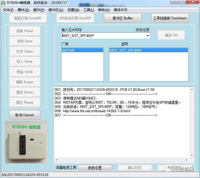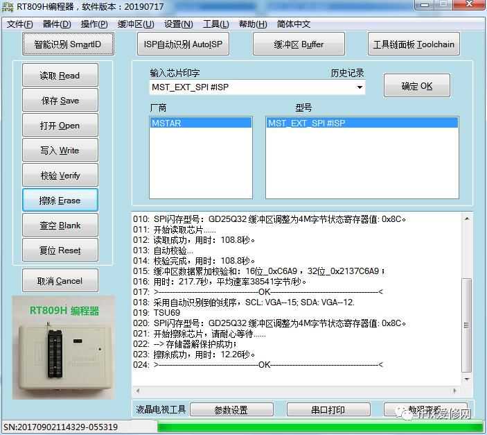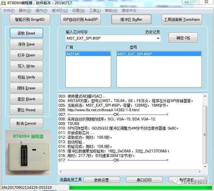 印制版号:主芯片:TSU69KBT-Z1-STFLASH:GD25Q32CSIG软件支持:20190717及其以后版本读取1.将主板VGA与编程器VGAISP端口连接,然后给主板通电。4.保存读出的......