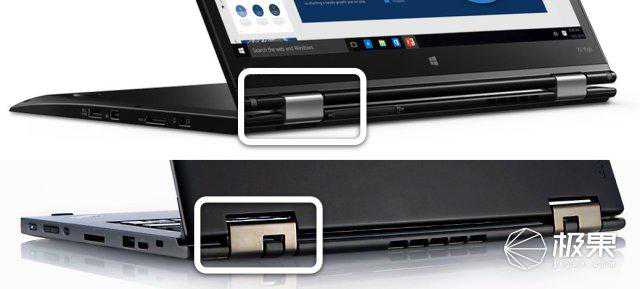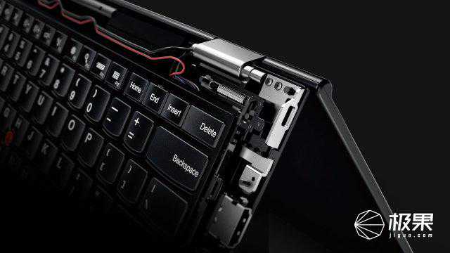 对比2013年初代ThinkPadYOGA,尽管前文吐槽过电源和音量键不思进取,但变形的关键YOGA金属转轴则经过了彻底的重新设计。外观上,X1YOGA的转轴没有了之前凹进去的一块,视觉上更为规整流畅。耐用度上,新转轴可以承受3万次以上的开合,即每天开合电脑8次,能用十年以上。