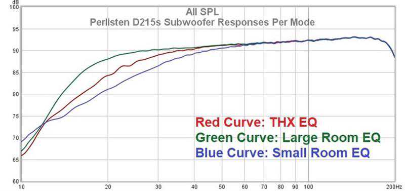 上图显示了PerlistenD215s低音炮在每种EQ模式下测量的频率响应。