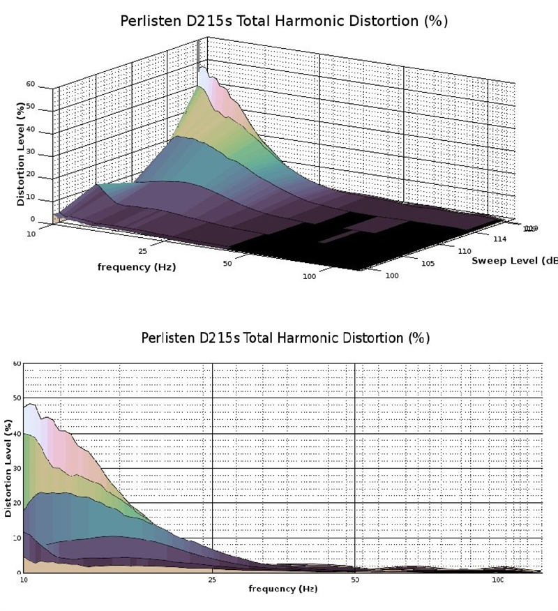 D215s在这项测试中给出了一些惊人的数字,这也符合对其规格参数的预期,该低音炮的完整表现我们将通过测量的失真数据来讲述。这是一个密闭低音炮,无论如何努力驱动,20Hz以上都无法出现超过的10%失真,它在20Hz以下也几乎没有突破10%。所有这些失真量都远远低于任何可听到的声音,我们测试过的其他密闭式低音炮都无法以如此低的失真来匹配这种输出声压。除了10Hz的测量,所有的频率都只受到放大器的限制,而不受失真限制,这意味着低音炮根本无法达到CEA-2010的失真阈值。甚至我们的10Hz测量也受到了背景噪音而不是谐波的限制(由于环境噪音的影响,通过10Hz测量总是非常困难的,因为相对于本底噪音而言,低音炮在如此深的频率上的输出通常不是很高)。