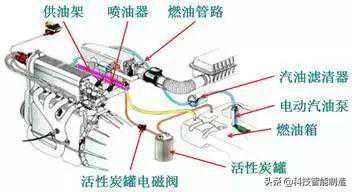 燃油喷射系统由燃油箱、燃油泵、燃油滤清器、燃油分配器、喷油器、油压调节器、燃油蒸汽回收装置等组成。