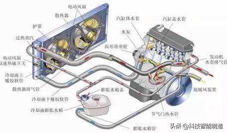 冷却系统包括水泵、散热器、膨胀水箱、冷却水管、冷却液、节温器、冷却液温度传感器、冷却风扇、液位传感器、冷却液温度报警灯与冷却液温度表等。