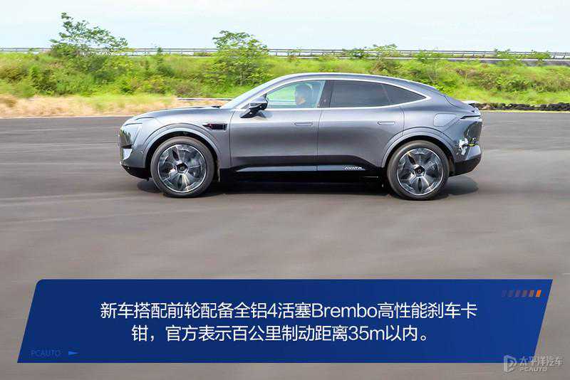 跑得快,更要杀得稳,阿维塔11搭配前轮配备全铝4活塞Brembo高性能刹车卡钳,官方表示百公里制动距离35m以内。35m的刹车距离是个什么概念?这已经是跑车级别的表现了。这次场地试驾也安排了百公里制动体验环节,时速超过100km/h全力踩下刹车,刹车力道很足,但得益于良好的前后配重以及底盘有大电池组压着,悬架系统也给到车身足够的支撑,车身在这种极限状态下点头的现象并没有预想中严重,刹车踏板也没有出现弹脚或者抖动的情况,整个急刹车过程变现的相当稳定,不过这次并没有带上专业的测试仪器,它能否做到35m以内的百公里制动距离还有待考究。