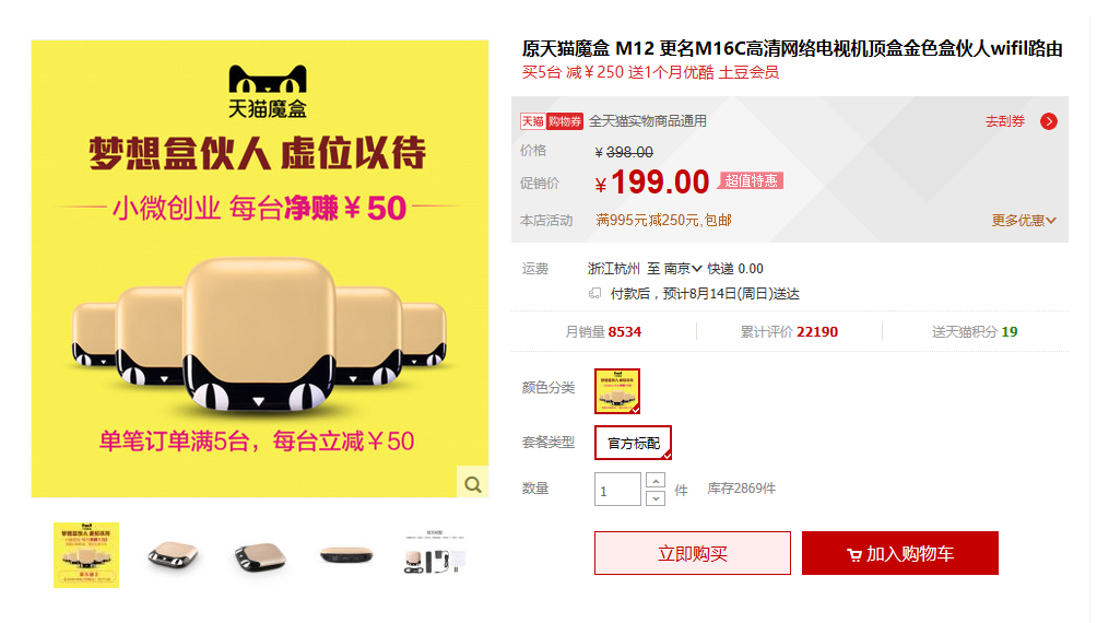 天猫魔盒是目前网络机顶盒中非常受欢迎的产品,这是阿里巴巴联合著名智能电视盒子厂商TCL、创维、珠海迈科电子共同打造的网络高清机顶盒。目前天猫魔盒最新的一款是天猫魔盒M16C(优酷定制版),相对于其他的电视盒子,这款天猫魔盒M16C还是比较有特点的。不仅可以电视购物,还能边看电视边淘好东西,赚积分兑换商品。相当有性价比和趣味性。
