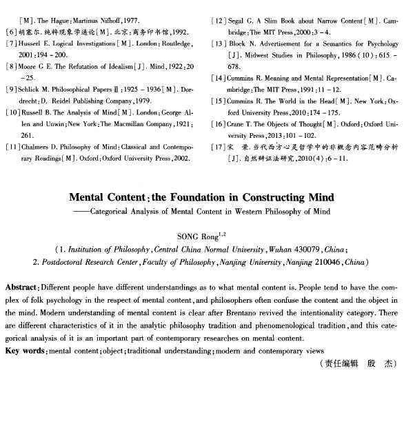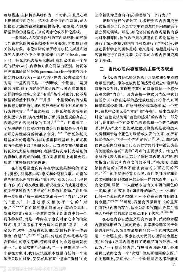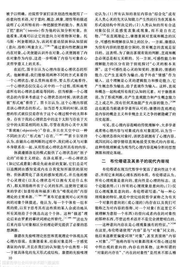 【摘要】心理内容究竟是什么?在西方心灵哲学中不同学者对此有着不同的解读。在传统理解中人们通常保留着对心理内容的民间心理学情结,而一些哲学家们往往理所当然地将心灵中的对象与内容混同;在布伦塔诺复活意向性范畴之后,现代内容观被明确把握;当代心理内容范畴在分析哲学传统与现象学传统上各有特点,成为心理内容研究的重要组成部分。