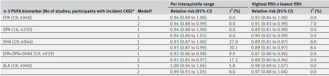 这项分析表明,海产品中的omega-3脂肪酸,诸如二十碳五烯酸(EPA)、二十二碳五烯酸(DPA)和二十二碳六烯酸(DHA)的摄入量与CKD的发生风险相关,即摄入较多的海产品omega-3脂肪酸可降低CKD的发生风险。然而,亚麻油的摄入量与CKD的发生风险无关。