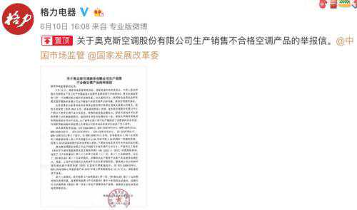 2019年6月,时值盛夏,格力官方发布了《关于奥克斯空调股份有限公司生产销售不合格空调产品的举报信》。