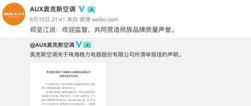 10分钟过后,奥克斯空调官微发布董事长郑坚江的话:
