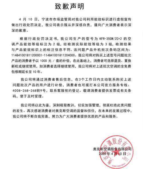 2020年4月10日,宁波市监管局对奥克斯空调利用能源效率标识进行虚假宣传作出“责令改正”和“处罚款十万元”的行政处罚决定。