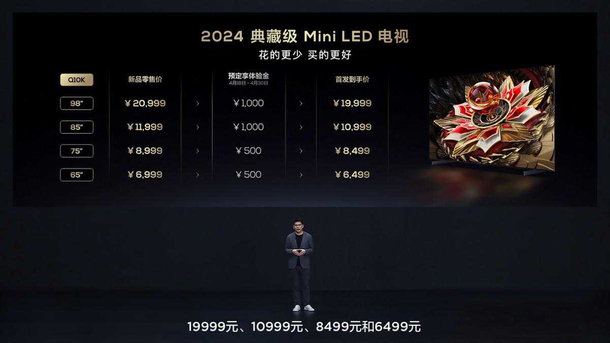 Q10KPro全系共4个尺寸,分别是98吋、85吋、75吋和65吋,预售期间,98到65吋返体验金后到手价分别是:23999元、14999元、10999元、7999元。目前Q10K和Q10KPro都已经开启全网预售,并在4月30日晚8点正式开售!
