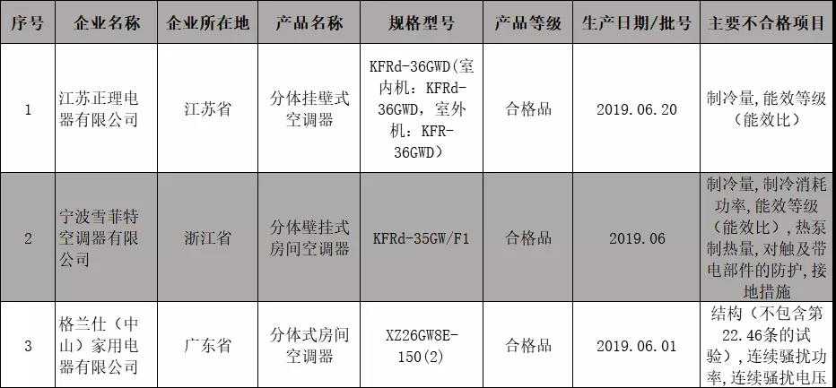 三批次不合格空调信息如下:一批次标称江苏正理电器有限公司生产的分体挂壁式空调器(规格型号:KFRd-36GWD(室内机:KFRd-36GWD,室外机:KFR-36GWD)),制冷量、能效等级不合格。一批次标称宁波雪菲特空调器有限公司生产的分体壁挂式房间空调器(规格型号:KFRd-35GW/F1),制冷量、制冷消耗功率、能效等级(能效比)、热泵制热量、对触及带电部件的防护、接地措施不合格。一批次标称格兰仕(中山)家用电器有限公司生产的分体式房间空调器(规格型号:XZ26GW8E-150(2)),结构、连续骚扰功率、连续骚扰电压等项目不合格。