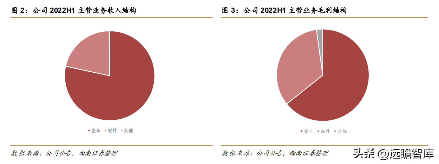 公司主营业务结构:公司业务分为整车和配件两大业务,22H1公司整车销售同比-71.7%至120.2亿元,占总营收78.4%,配件销售同比-34.2%至32.8亿元,占总营收21.4%。