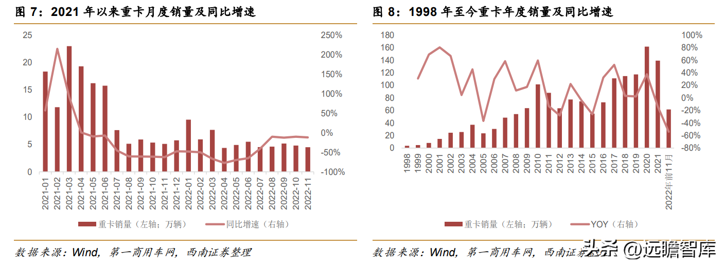 而今年受需求透支效应影响,假设12月销量环比11月持平的情况下,22年销量/21年的保有量仅7.3%,未来随着需求透支效应的出清以及重卡保有量的增加,以2021年907万辆保有量和10%的更新率(即10年进行更新换代)测算,每年的更新需求约91万台,再加上一些出口需求和新增需求,销量有望达到百万级水平。
