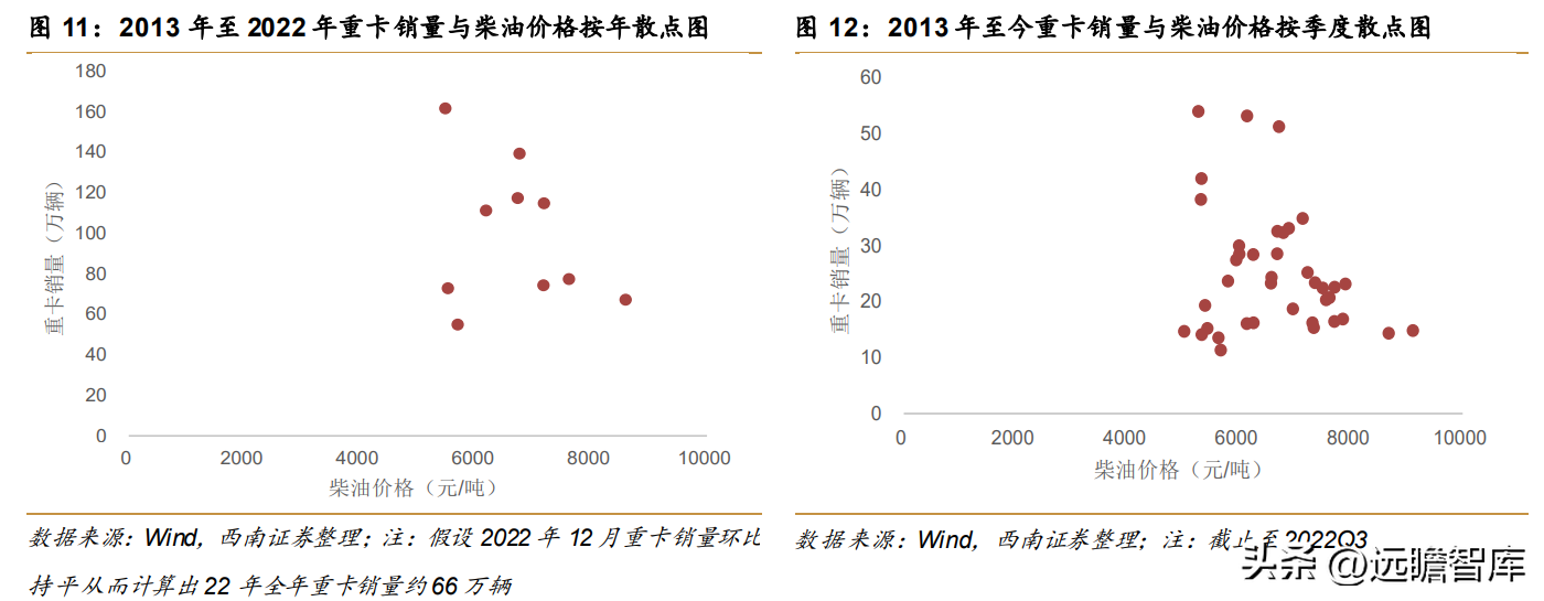 2013年至今,柴油指导价与重卡销量按年度的相关系数为-0.28,说明燃油价格上涨会一定程度抑制重卡销量增长。2022年燃油价格持续上涨,9月柴油价格相比2021年12月已上涨20.8%,燃油价格上涨使货运成本增加,也是导致重卡销量走低的一个重要因素。