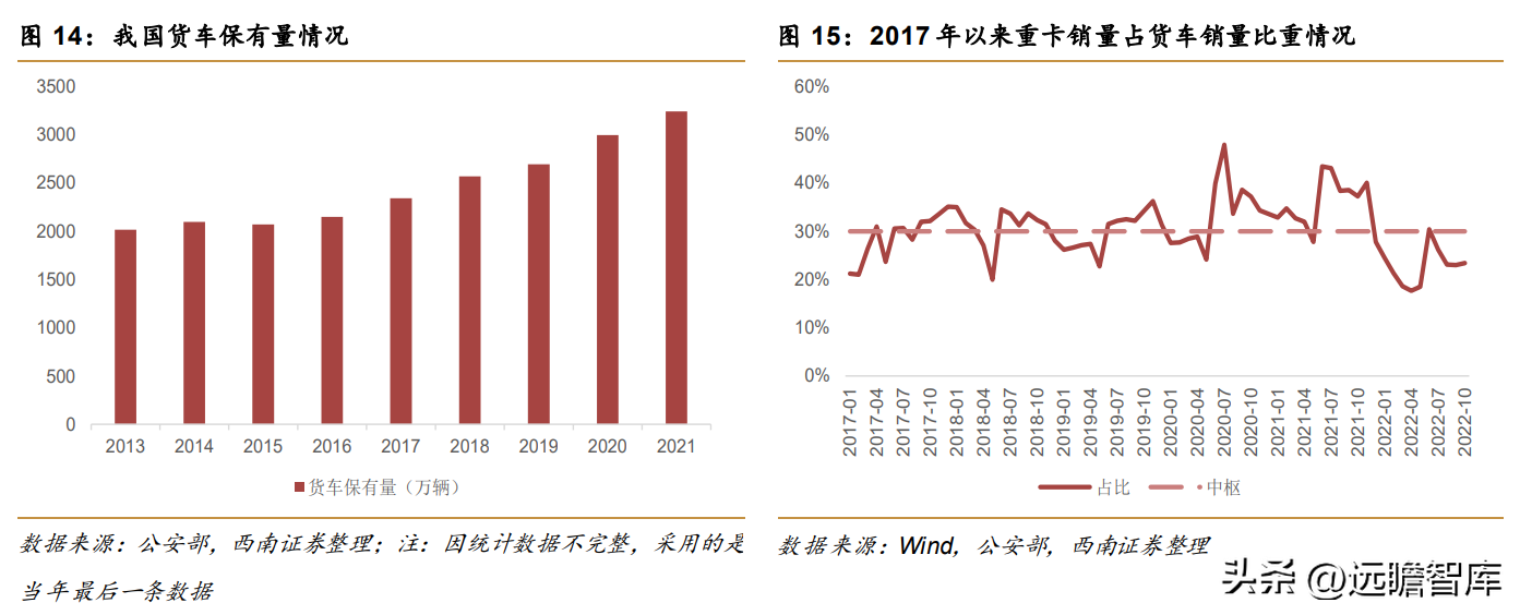 而根据公安部数据,21年货车保有量3242万辆,按照这个基数以及40%的国六和新能源货车保有量测算,2025年国六或新能源货车的保有量需达约1297万辆,而自2021年1月针对非重型货车的国六政策全面执行以来,至22年10月,非重型货车销量约为475万辆,自2021年7月针对重型货车的国六政策全面执行以来,至22年10月,重型货车销量约92万辆,在不剔除出口的情况下,则还需要730万辆才能完成目标,而重卡销量平均占货车销量30%,则在不剔除出口的情况下重卡销量还需219万辆才能完成目标。
