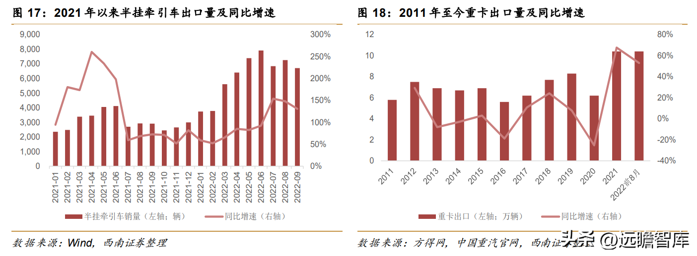 根据中汽协数据,2022年前10月实现货车(包括重型与非重型)出口约40.6万辆,2021年货车(包括重型与非重型)出口约36万辆,根据方得网数据,其中重卡出口约7万辆,假设上下半年出口销量相同,则需要剔除的出口量约为73万辆。