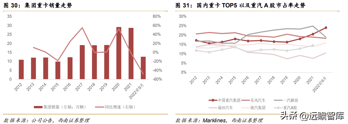 2013年至2021年,集团口径重卡销量从12.1万辆增至28.6万辆,%,也显著优于行业,2022年前9月受行业不景气影响,集团重卡销量同比下滑48.2%至12.6万辆,但降幅明显小于行业(57.5%),因此,公司市占率显著提升,2022年前9月公司国内市场份额已达到24%,较21年同期提升4.4pp,超越一汽解放成为行业龙头。