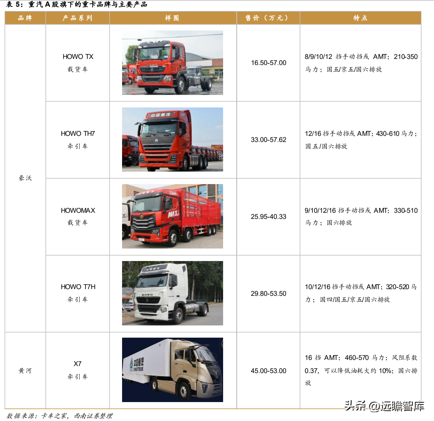 黄河是2020年公司推出的全新一代高端重卡品牌,目前推出了黄河X7车系。相较豪沃的在售车型,黄河X7性能更好,全系搭载16档自动挡AMT变速箱,风阻系数仅为0.37,可节油约10%,起步价45万元,比豪沃在售主流牵引车型起步价高12-15.2万元。