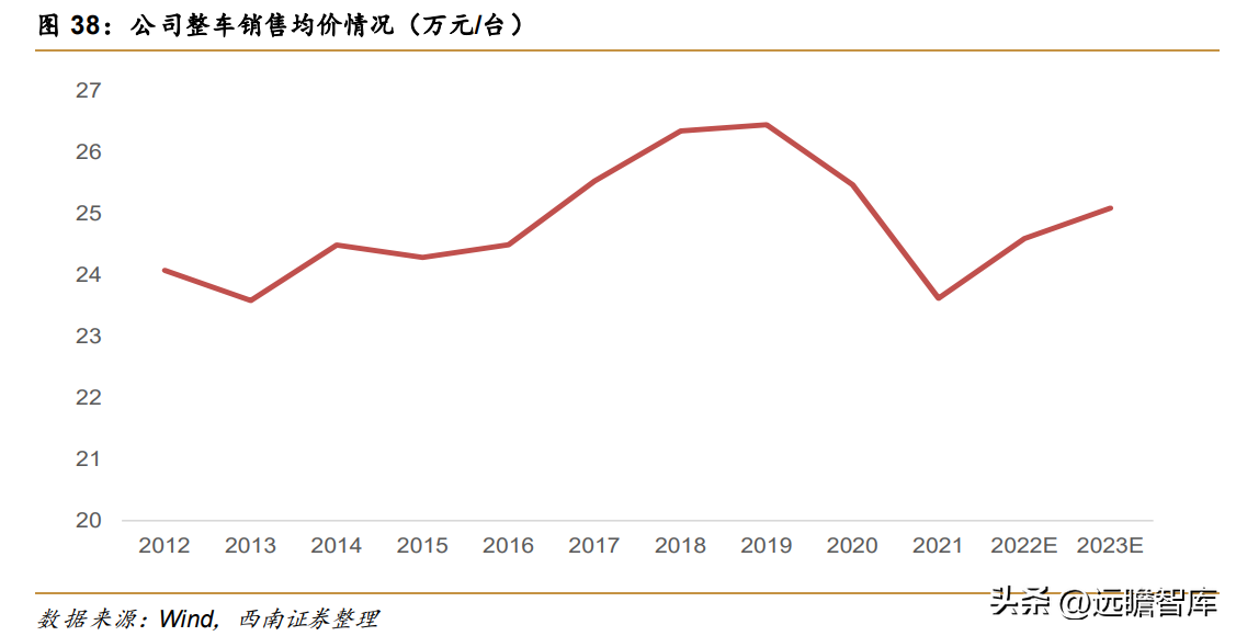 2020年以来,公司整车销售单价有所下降,但实则属于正常现象,主要是由于新国标国六即将全面执行,整个行业都会对现有的国五车型进行打折促销,而2021年7月起新国标已全面执行,国六车型将全面取代国五车型,而国六本身排放标准更高,成本更高,加之不再打折促销,预计整个销售均价将显著高于之前,另外,从历史数据也可以验证,新国标全面推行后的均价将显著高于之前两年,如2014年就是国四全面推行后的第一个整年,销售均价同比提升0.9万元,比2012年也提升0.3万元;