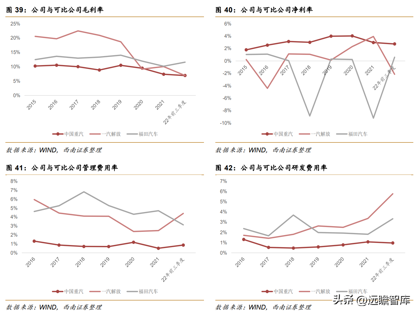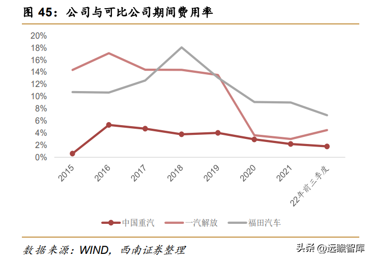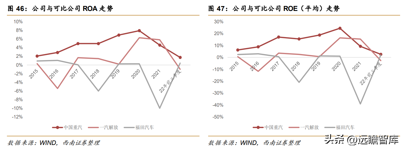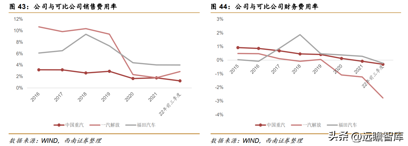 横向来看,公司毛利率与一汽解放和福田汽车相比要略低一些。虽然毛利率重汽A股一直不如一汽解放和福田汽车,但是得益于公司较好的费用管理能力,公司期间费用率一直处于行业较低水平,最新22Q3公司期间费用率为1.8%,显著低于一汽解放和福田汽车,这也使得公司的净利率长期处于行业领先地位,最新22年前三季度公司净利润为2.7%,显著高于一汽解放和福田汽车。
