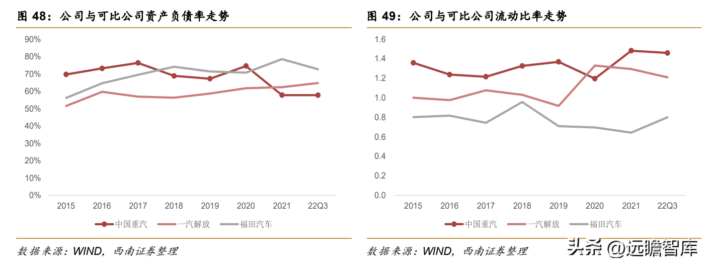 2015年-2020年,公司总资产周转率持续提升,主要是得益于重卡行业销量持续提升,公司产能利用率持续提升,2021年以来随着行业销量下滑,公司总资产周转率也连续下降,2022前三季度公司总资产周转率为0.64次,同比降低0.64次,和可比公司相比,公司总资产周转率处于行业中上游水平。