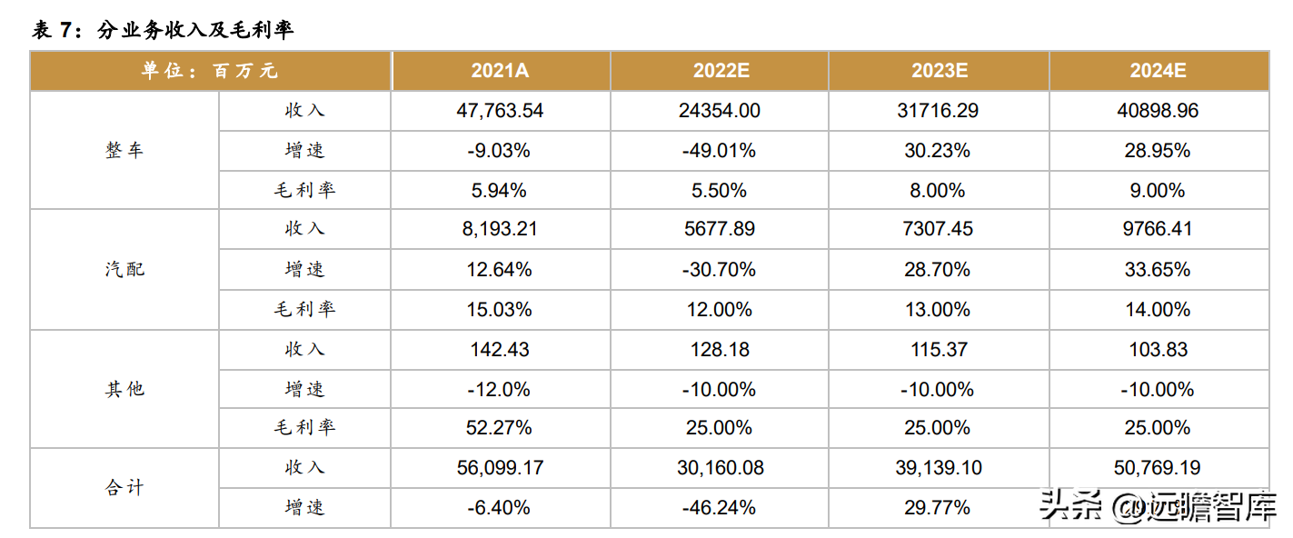 假设3:随着产能利用率提升和产品结构优化,公司毛利率将显著改善,假设22-24年公司整车毛利率分别5.5%、8%、9%,汽配毛利率分别12%、13%、14%。