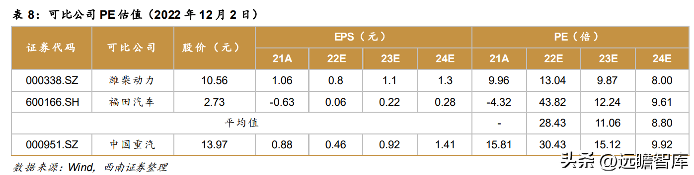 我们选取潍柴动力、福田汽车作为可比公司,2023年两家公司平均PE为11倍,目前行业估值较低原因在于重卡行业不景气,未来随着行业景气度提升,行业标的估值均将得到修复。