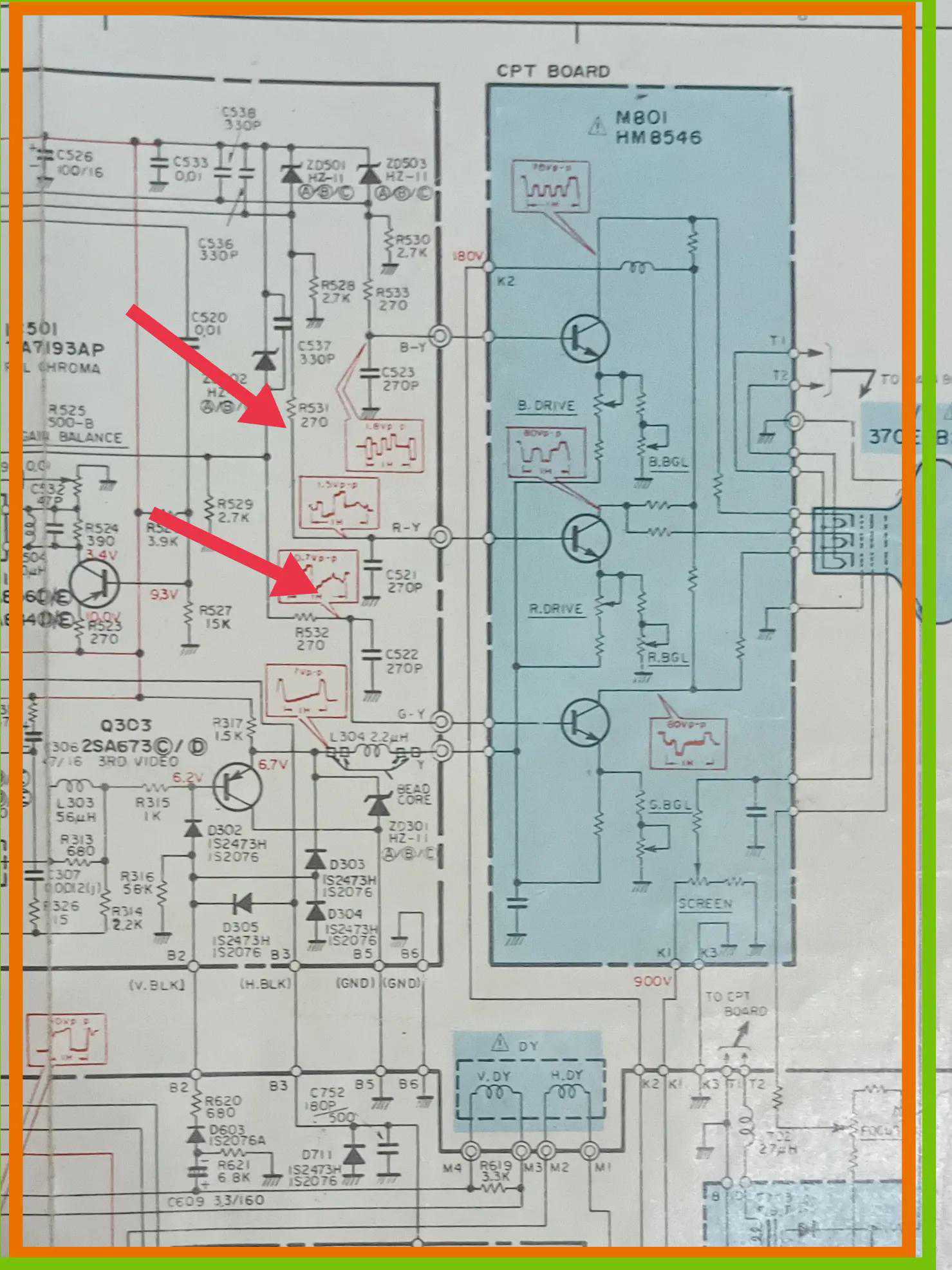 无基极偏置电压而处于截止状态,因此无红和绿两种基色输出。分析透了,“顺藤摸瓜”,首当其冲查从解码板上进入厚膜HM8546的“排头兵”R531,R532,焊下这二个电阻,用万用表测查,双双断路。重新换上二个同规格电阻,检查无误,再开机,赤橙黄绿青蓝紫,五彩缤纷!