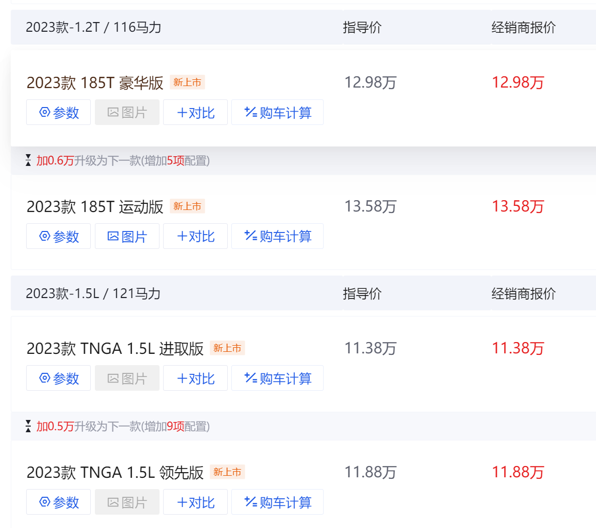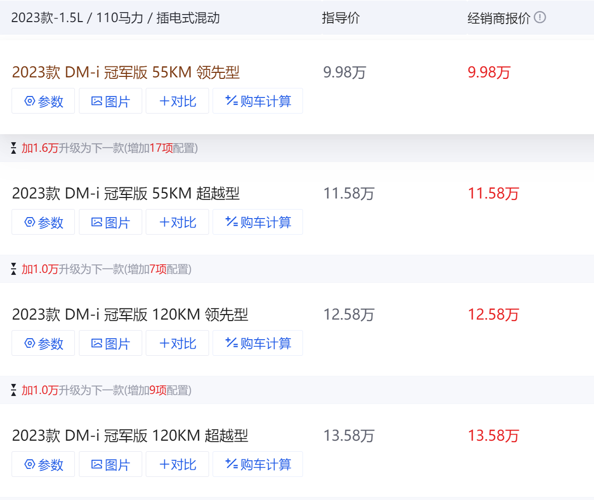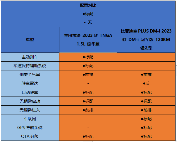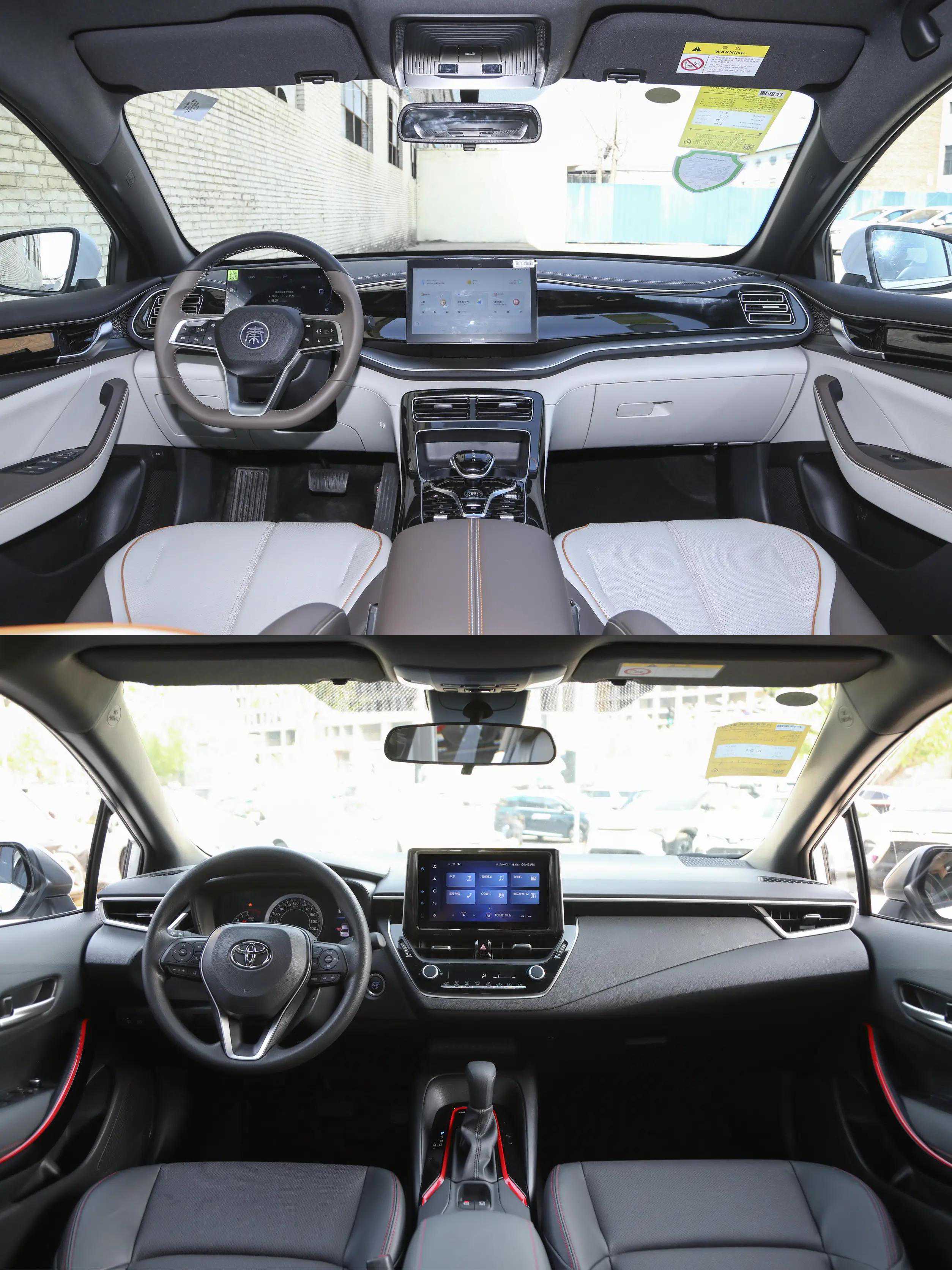 丰田雷凌选择的是2023款豪华版,售价为12.78万元。比亚迪秦PLUSDM-i选择的是2023款DM-i冠军版120KM领先型,售价为12.58万元,从上述表格得知,两款车型的配置差距不大。