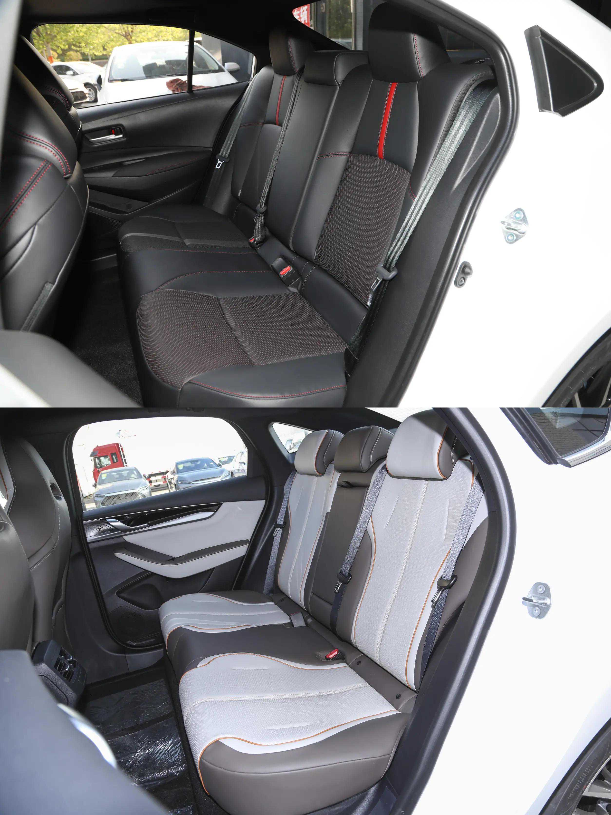新款丰田雷凌的车尾设计的高耸大方,后备厢盖上的描述的比较清晰,尾灯组设计的圆润大方,中间还装饰了亮黑色的饰条,反光灯带是竖状的样式,并且进行了凹陷式的处理,呈现出一定的立体感,后包围装饰了夸张的护板。比亚迪秦PLUSDM-i的车尾设计的沉稳大方,贯穿式的尾灯组进行了熏黑的处理,后包围处理的层次感分明。