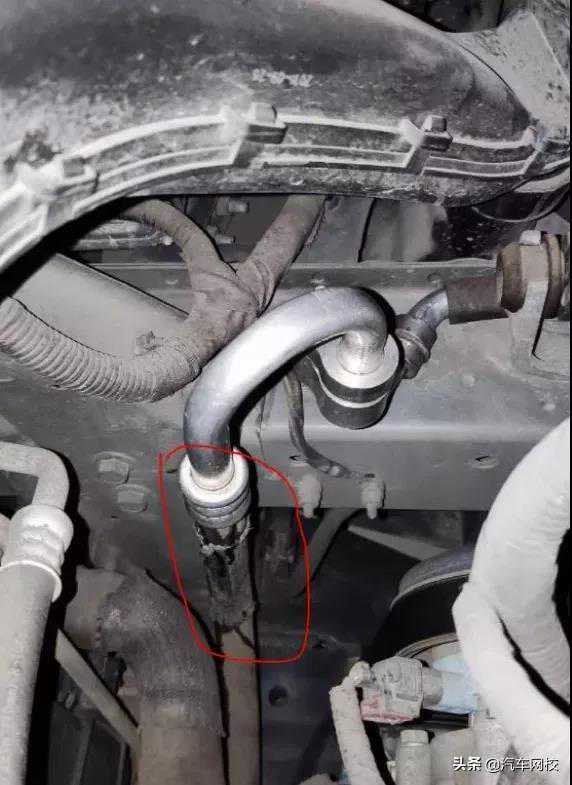 故障表现为发动机前舱空调低压管接口有油漏出来,停车后打开前舱就能看见。