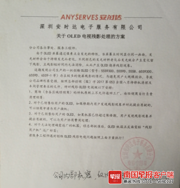 网友“上官”现已离职。他向记者出示了多份处理方案,包括《关于OLED残影和LCD屏幕大规模漏液批次质量问题的处理方案》《深圳安时达电子服务有限公司关于OLED电视残影处理的方案》《关于OLED残影和LCD屏幕漏液批次质量问题的处理方案》等。