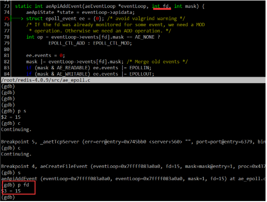 如何验证这个断点处挂载到EPFD上的fd就是侦听fd呢?很简单,创建侦听fd时,用GDB记录下这个fd的值。例如,当我的电脑某次运行时,侦听fd的值是15。如下图(调试工具用的是CGDB):