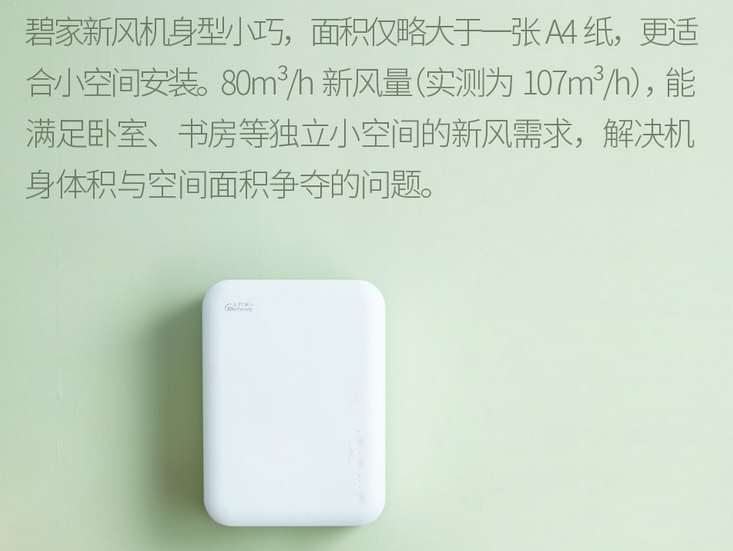 这款碧家新风机主打小巧体积,新风量上与米家C1同样都为80m³/h,400W电辅热可以保证冬季的新风温度保持较为舒适的温度。机身触摸控制不带有液晶显示屏,滤芯仅采用一块H13级别的高效滤芯作为过滤材。最小风量下运行噪音为24分贝。