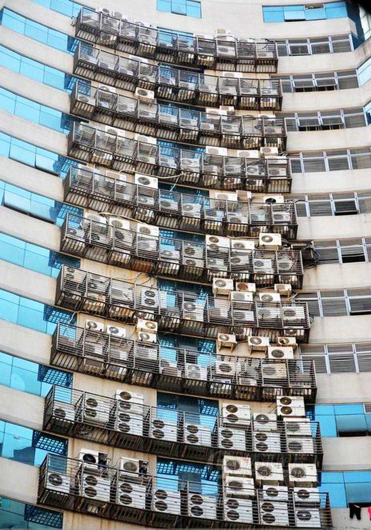 整栋大楼都没有空调外机位,空调全都直接挂在外墙上,看上去密密麻麻的,名副其实的最牛空调楼呢!