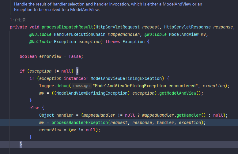 看这里,如果异常不为空,就直接走进异常的处理流程,我们就要返回去,看processDispatchResult之前的doDispatch方法