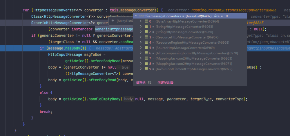 我们再往下走,来到这个循环里,可以看到,springmvc默认有多个转换器